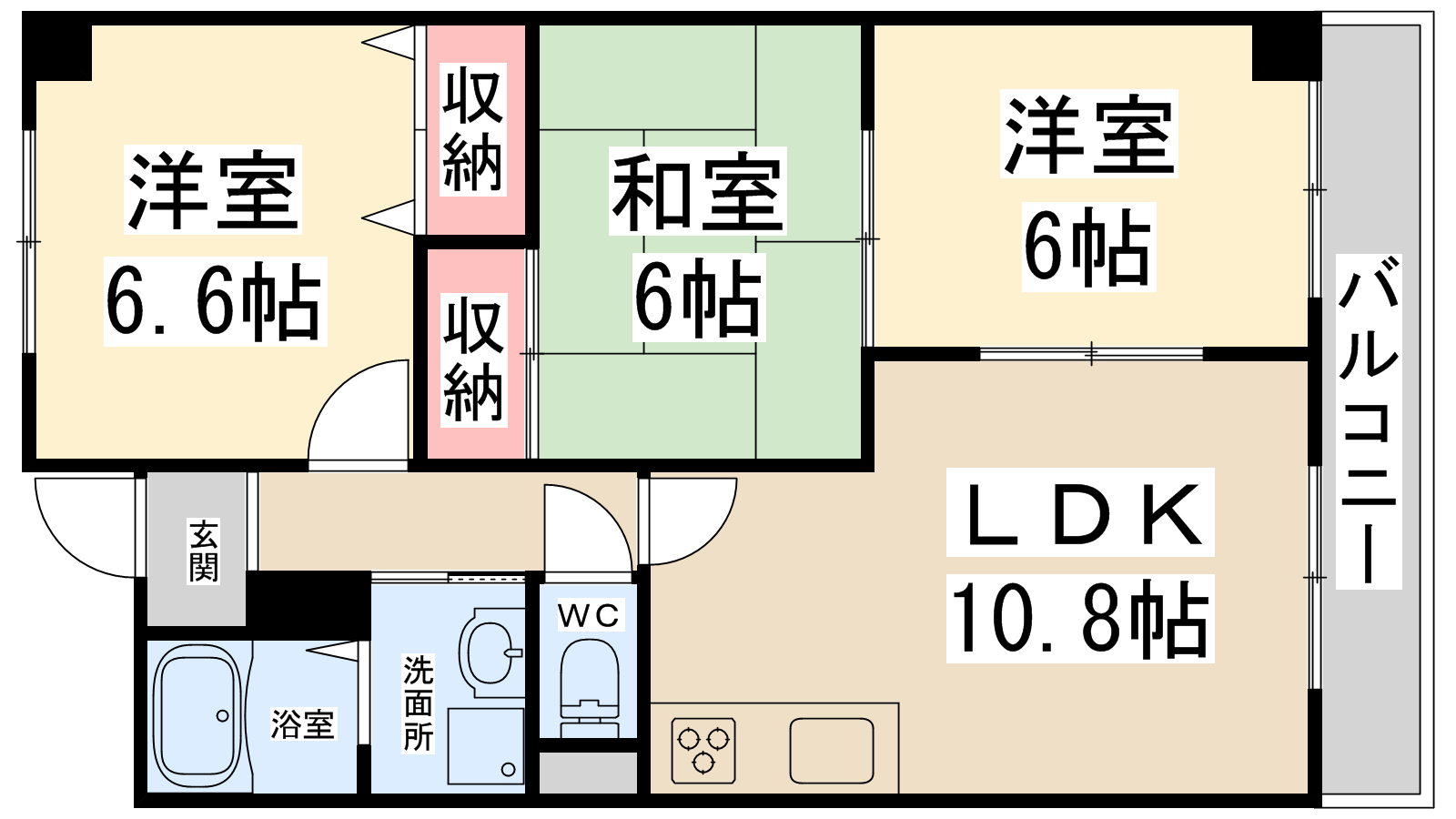 - LDK10.8帖、洋室6.6帖、洋室6帖、和室6帖