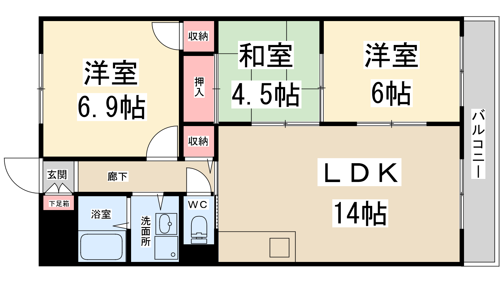 - LDK14帖、洋室6.9帖、和室4.5帖、洋室6帖