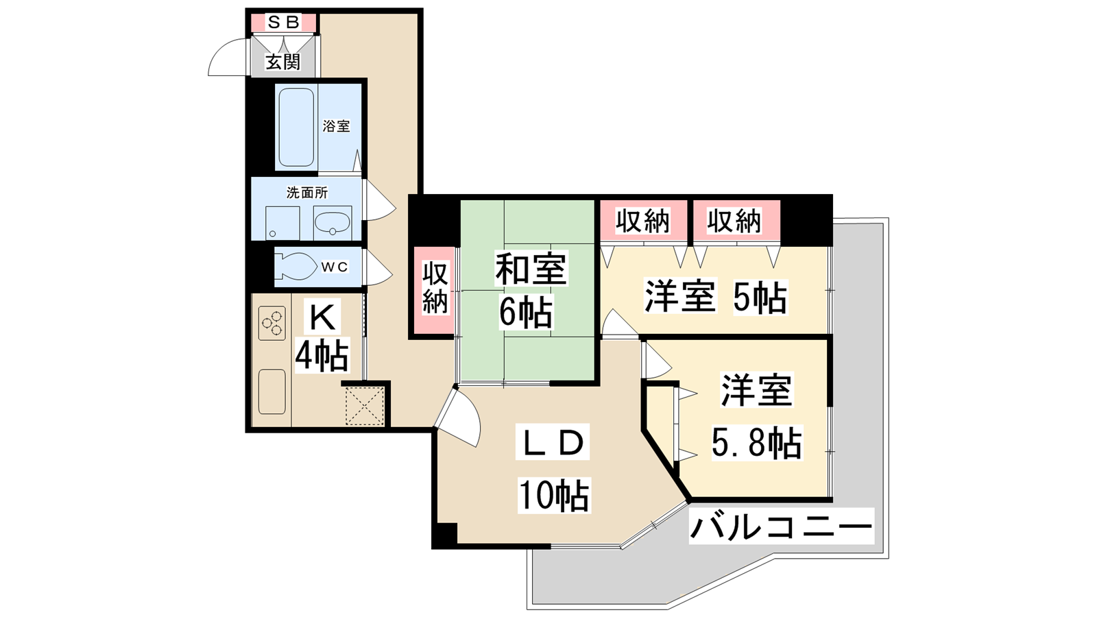 - LD14帖、洋室5.8帖、洋室5帖、和室6帖