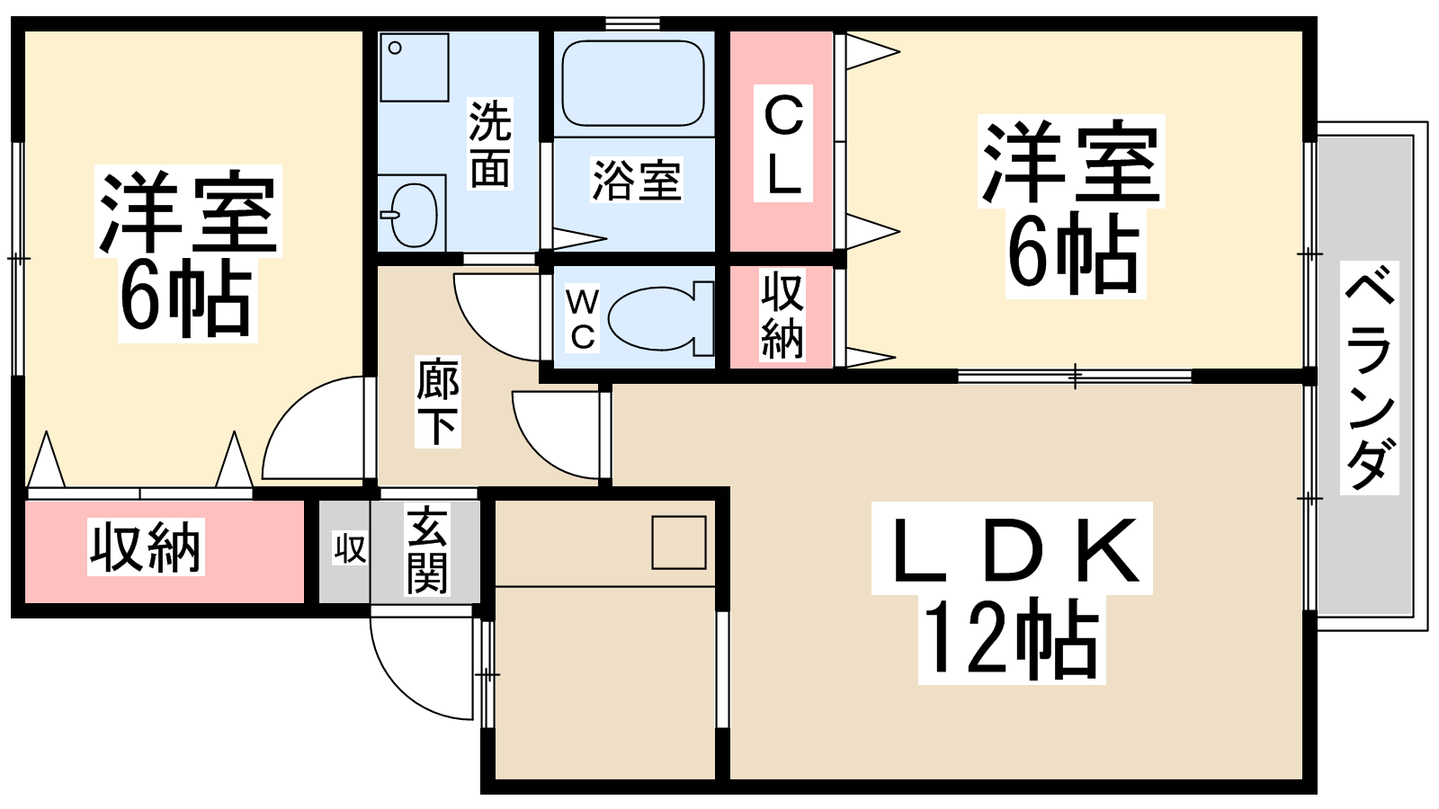 - LDK12帖、洋室6帖、洋室6帖