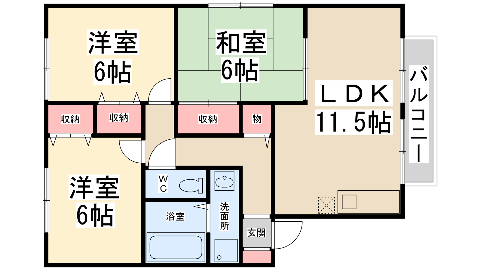- LDK11.5帖、洋室6帖、洋室6帖、和室6帖