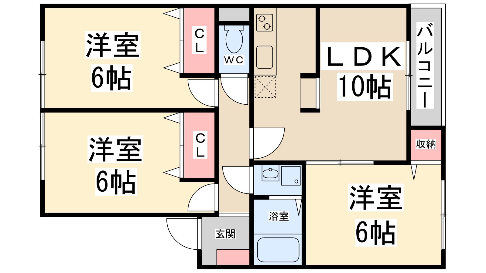 - LDK10帖、洋室6帖、洋室6帖、和室6帖