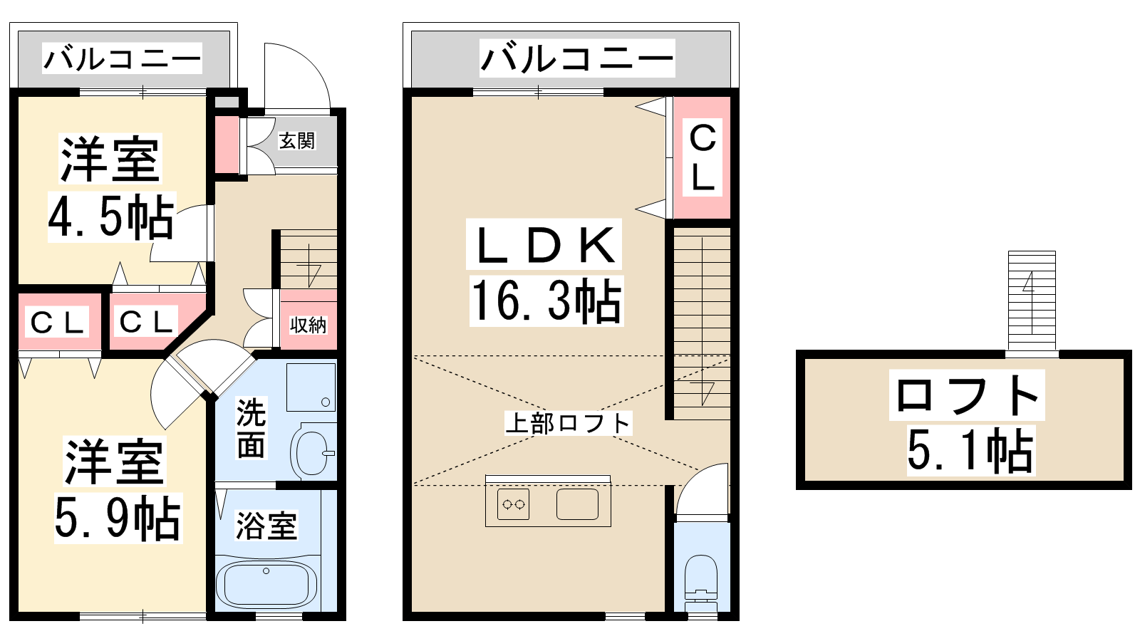 - LDK16.3帖、洋室5.9帖、洋室4.5帖