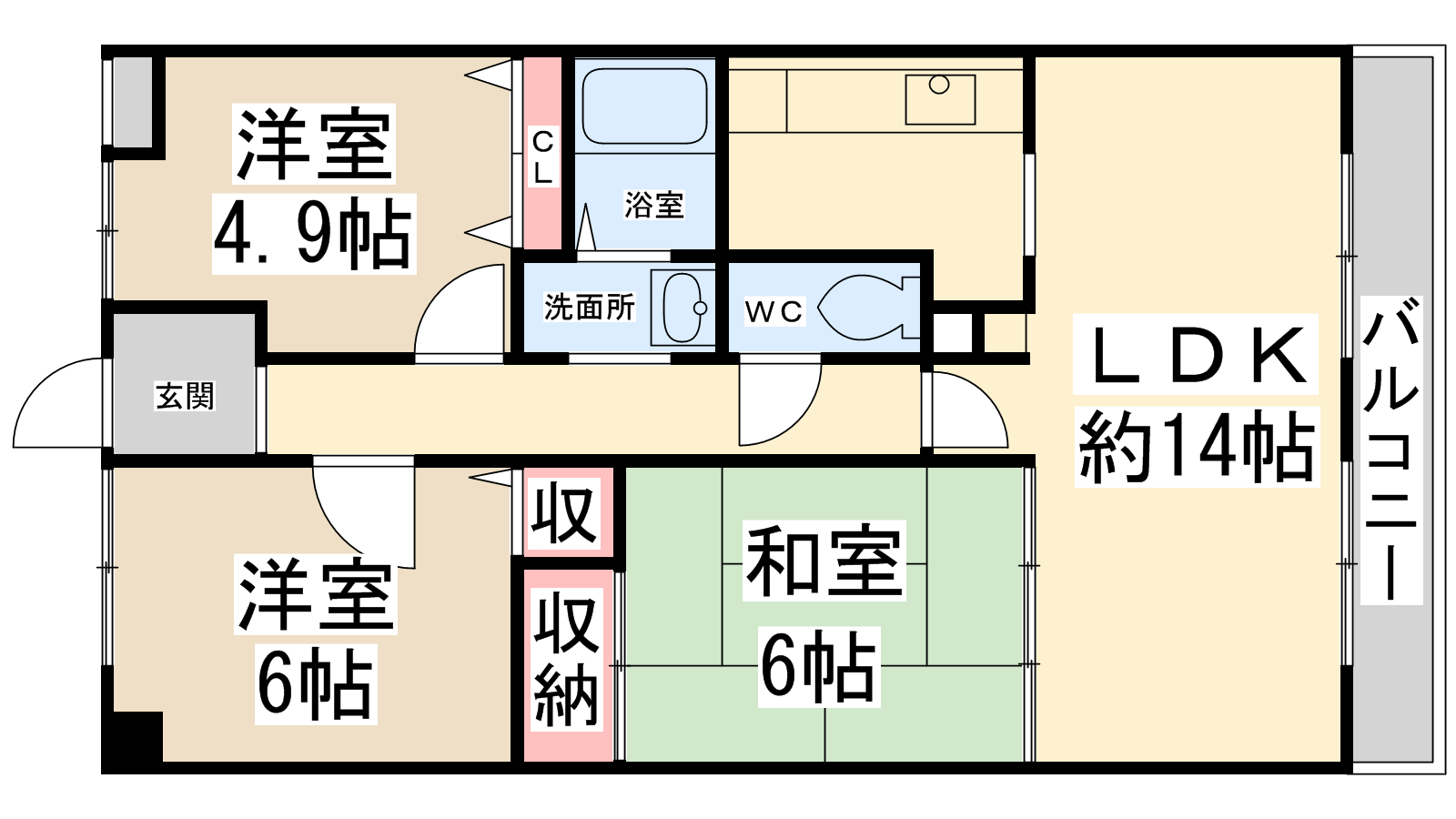 - LDK14帖、洋室6帖、洋室4.9帖、和室6帖