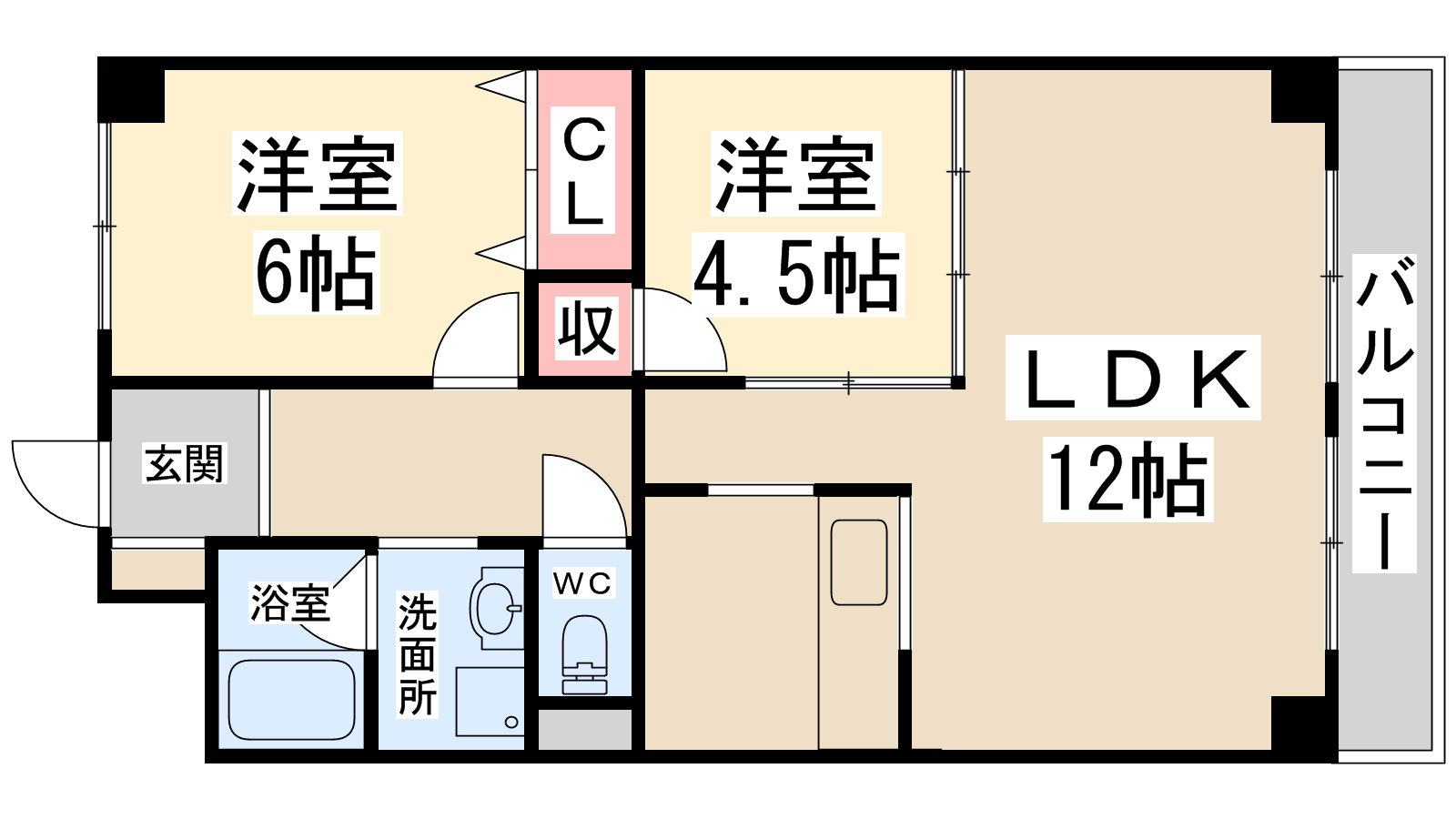 - LDK12帖、洋室6帖、和室4.5帖