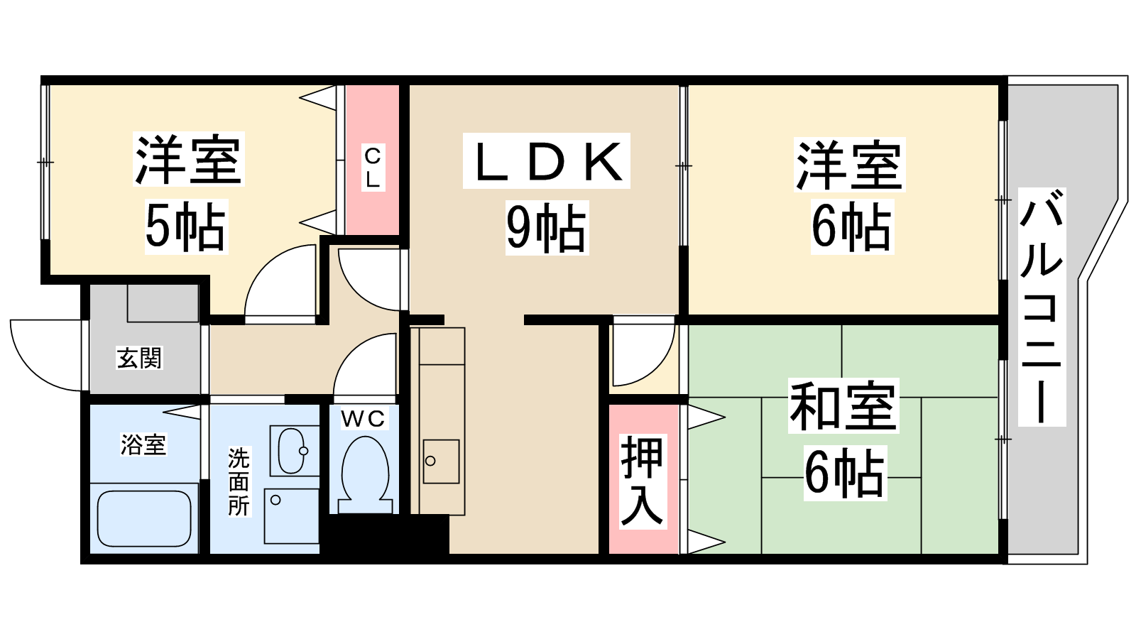 - LDK9帖、洋室6帖、洋室5帖、和室6帖
