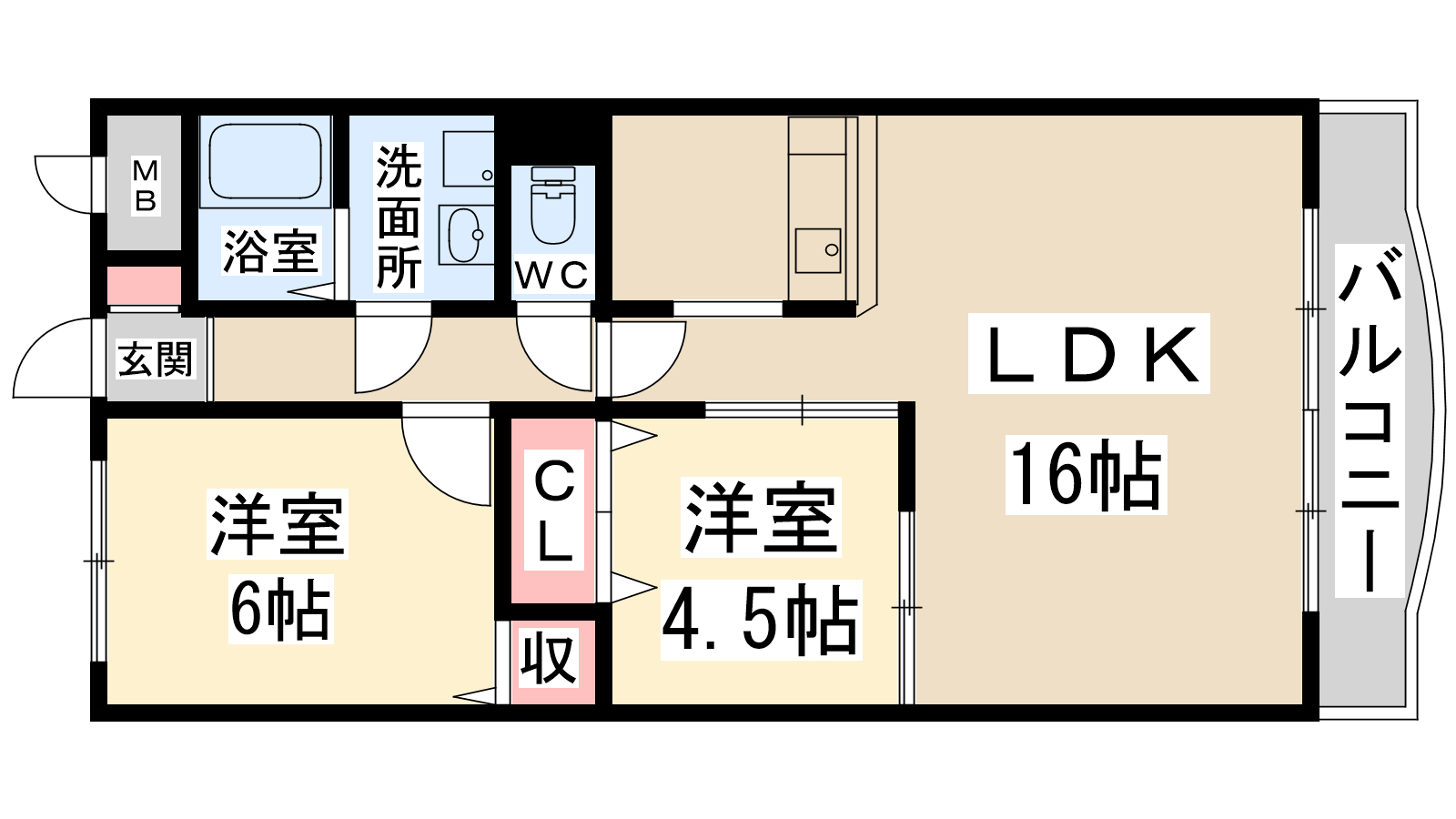 - 和室6帖、洋室4.5帖、LDK16帖