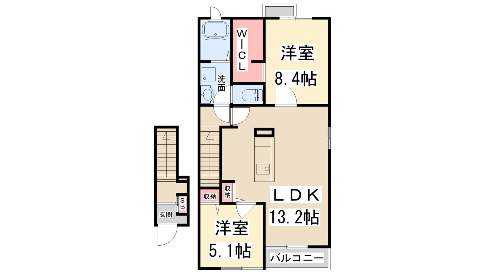 - LDK13.2帖、洋室8.1帖、洋室5.1帖