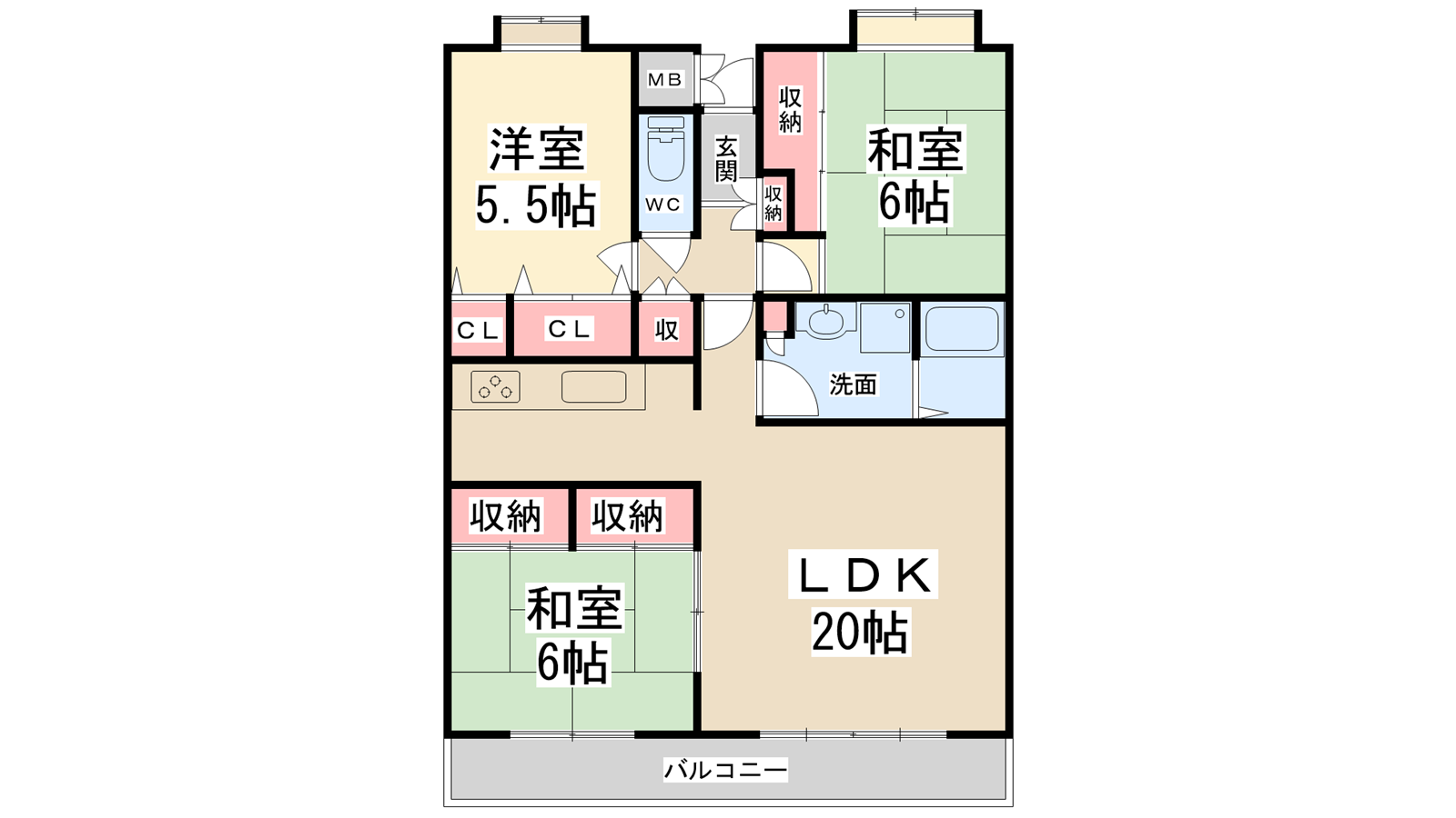 - LDK20帖、和室6帖、和室6帖、洋室5.5帖