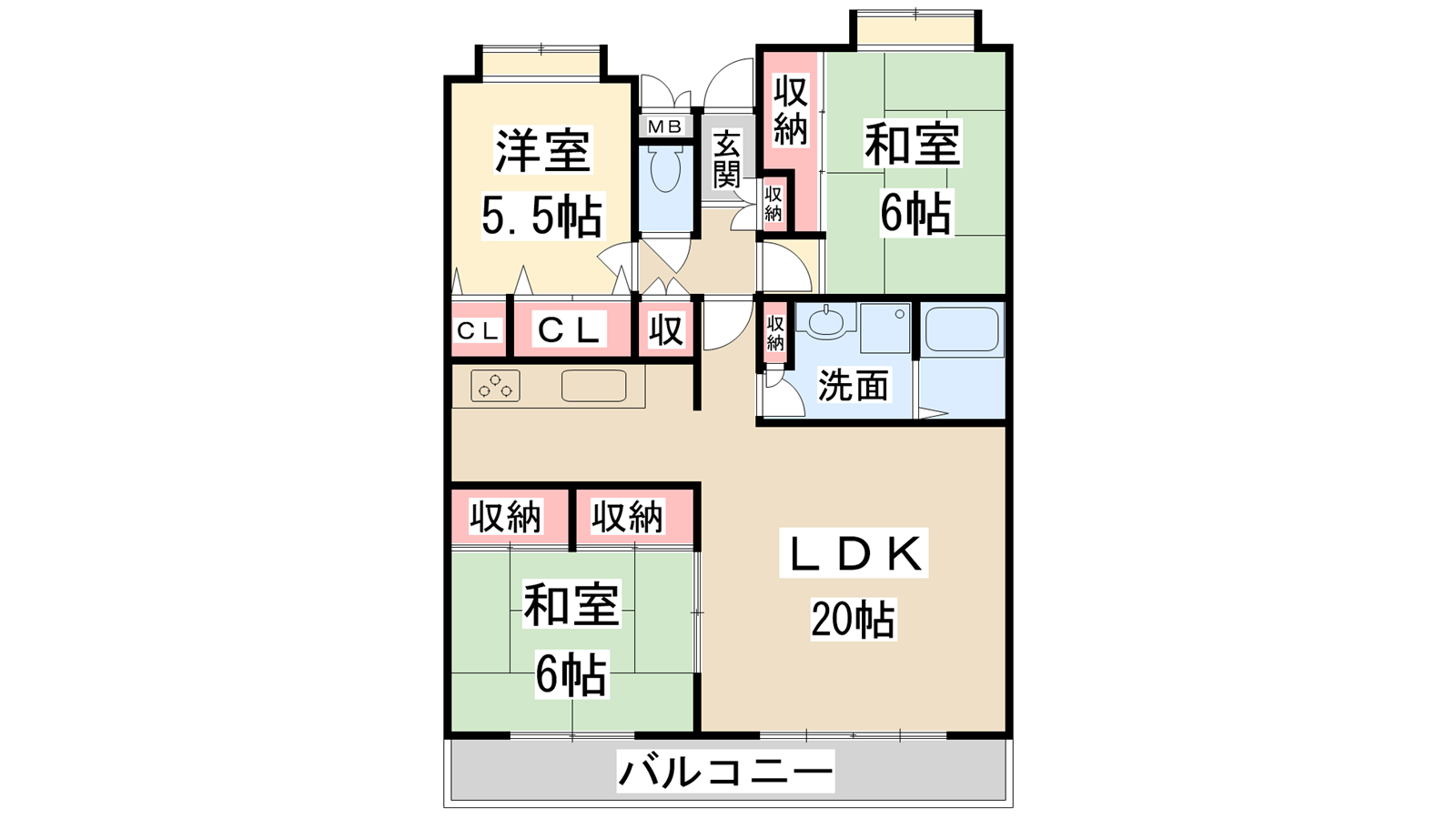 - LDK20帖、和室6帖、和室6帖、洋室5.5帖