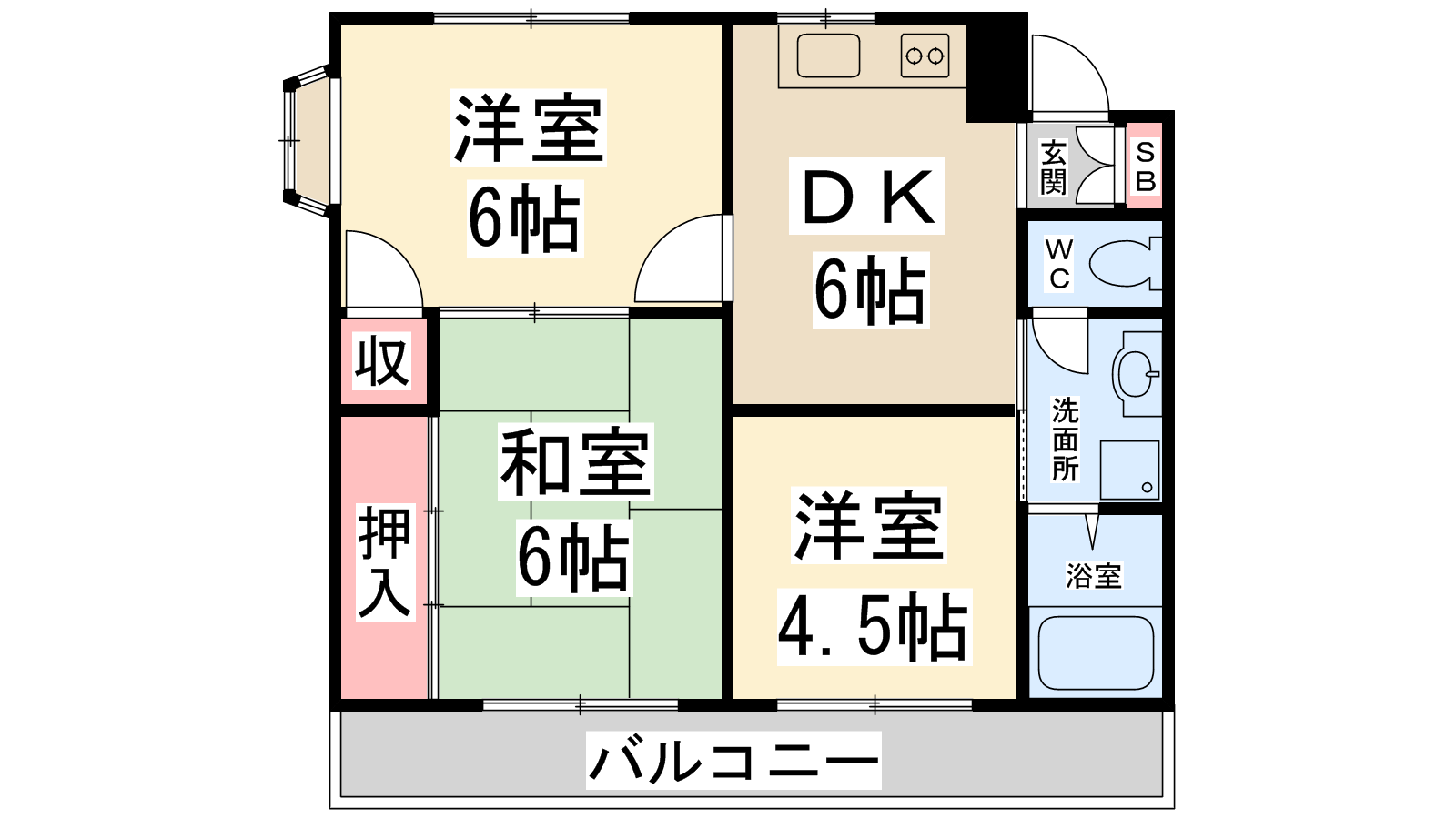 - DK6帖、洋室6帖、洋室4.5帖、和室6帖