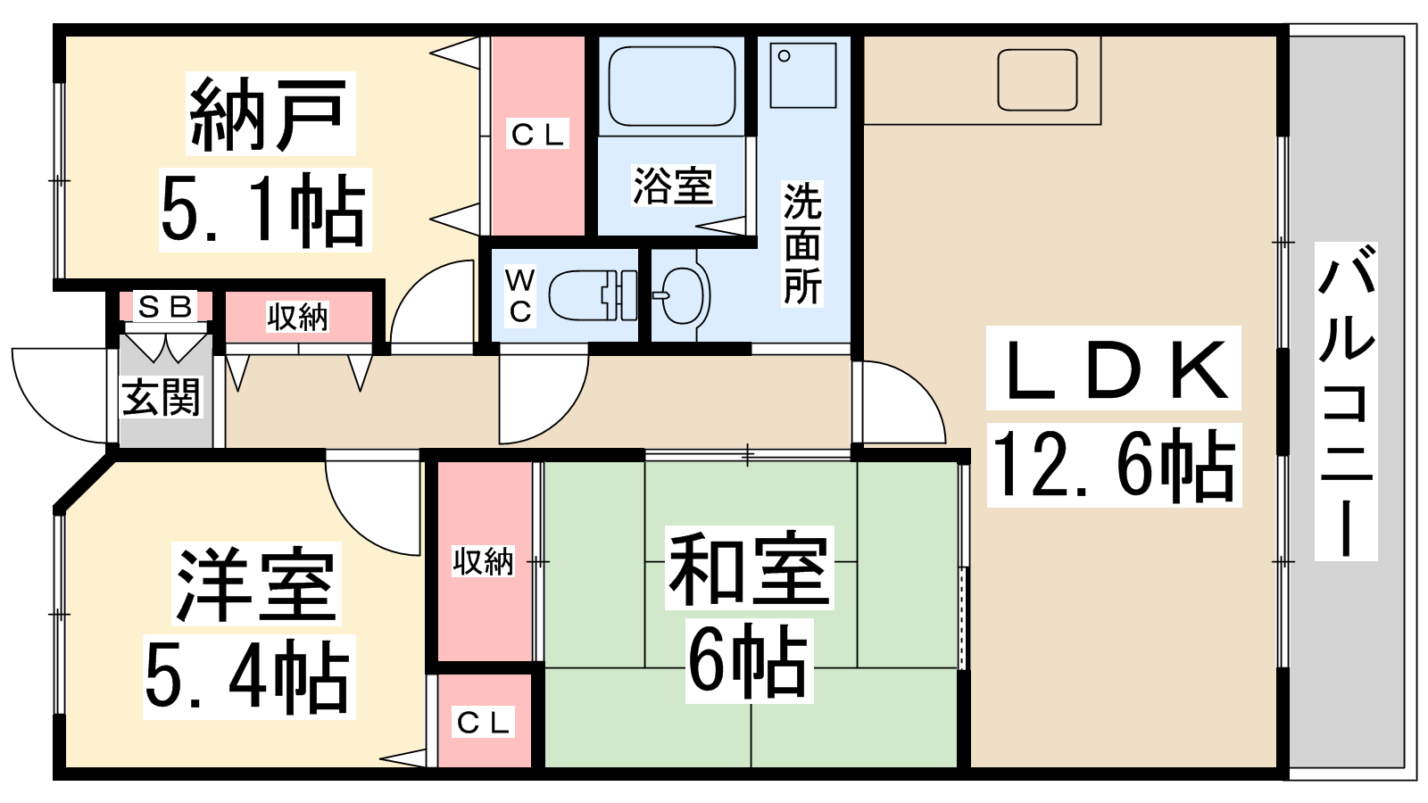 - LDK12.6帖、洋室5.4帖、S5.1帖、和室6帖