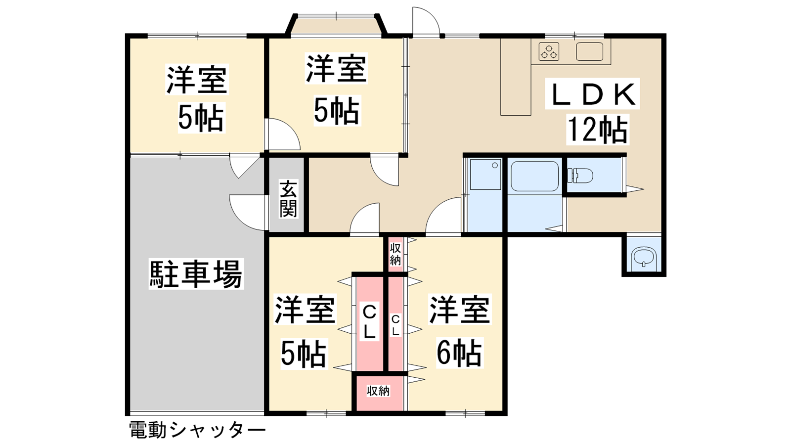 - LDK12帖、洋室6帖、洋室5帖、洋室5帖