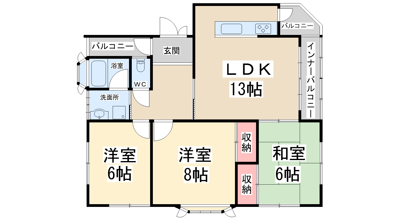 - LDK13帖、洋室8帖、洋室6帖、和室6帖