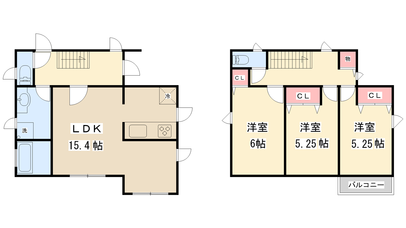 - DK15.4帖、洋室6帖、洋室5.25帖、洋室5.25帖