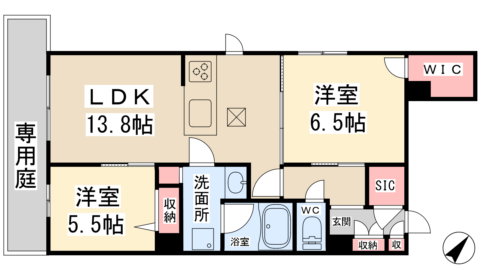 - LDK13.8帖、洋室6.5帖、洋室5.5帖