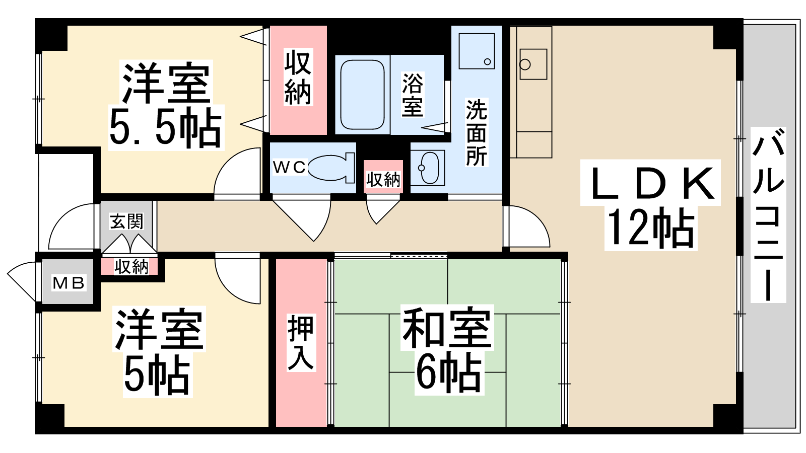 - LDK12帖、洋室5.5帖、洋室5帖、和室6帖