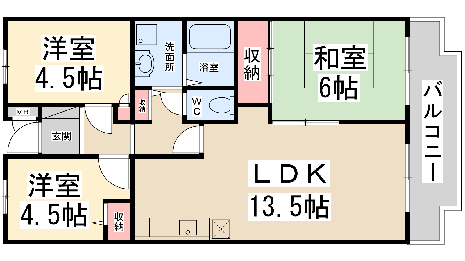 - LDK13.5帖、和室6帖、洋室4.5帖、洋室4.5帖