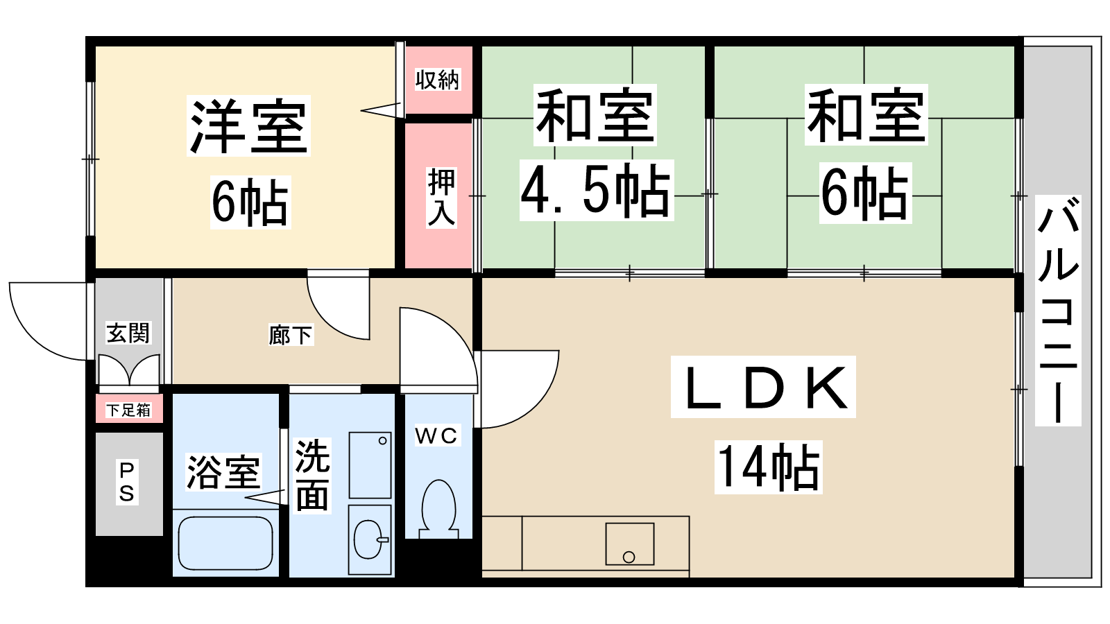 - LDK14帖、洋室6帖、和室4.5帖、和室6帖