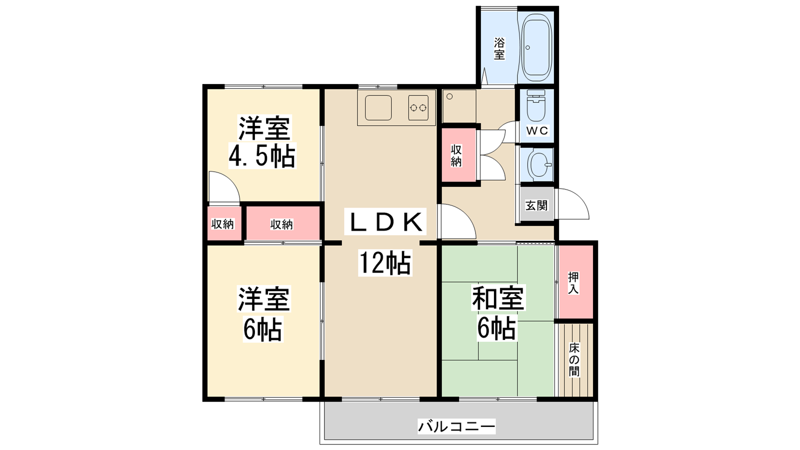 - LDK12帖、洋室6帖、洋室4.5帖、和室6帖