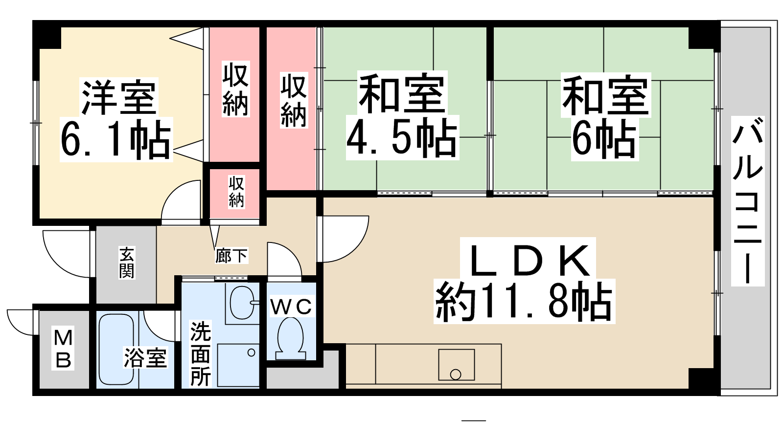 - LDK11.8帖、和室6帖、和室4.5帖、洋室6.1帖