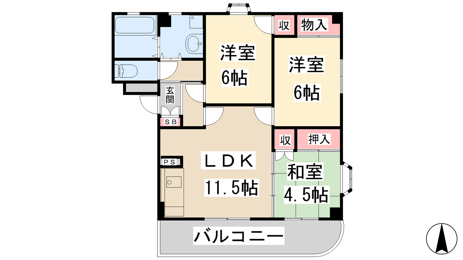 - LDK11.5帖、洋室6帖、洋室6帖、和室4.5帖