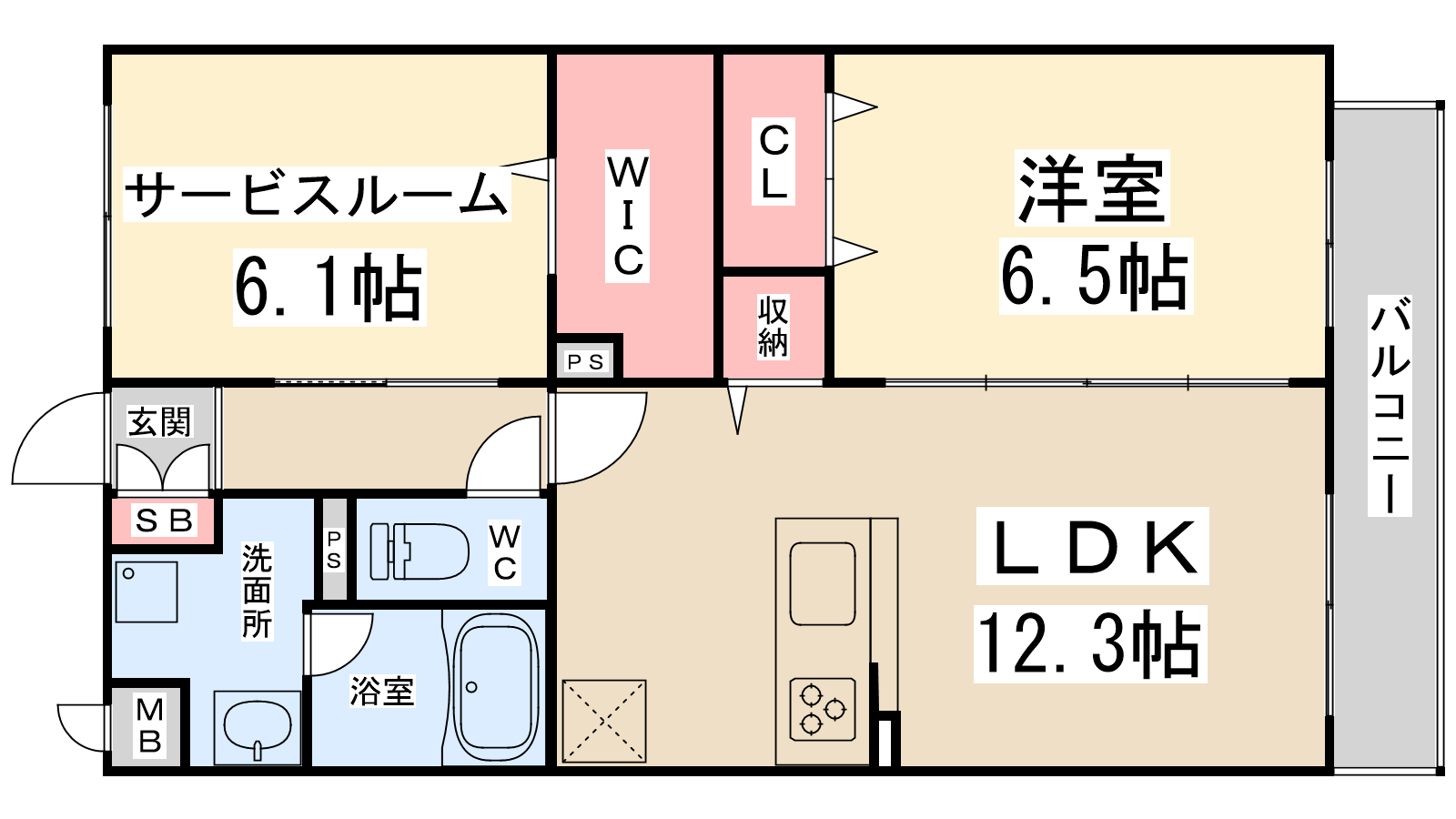 - LDK12.3帖、洋室6.5帖、S6.1帖