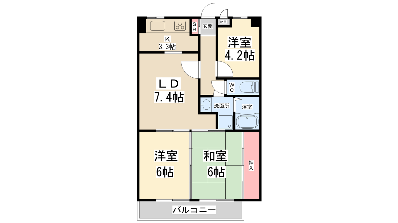 - LD7.4帖、K3.3帖、和室6帖、和室6帖、洋室4.2帖
