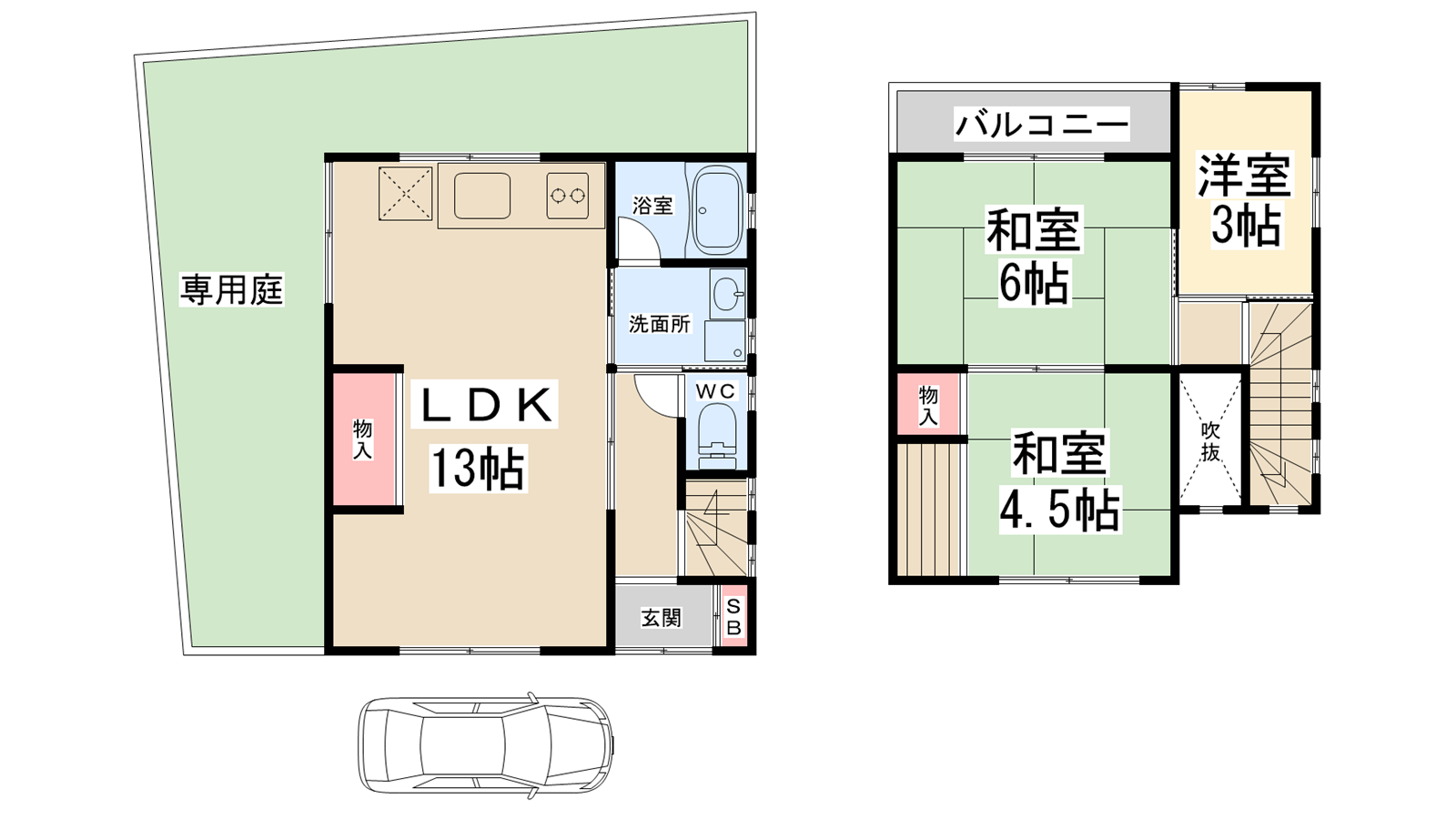 - LDK13帖、和室6帖、和室4.5帖、洋室3帖