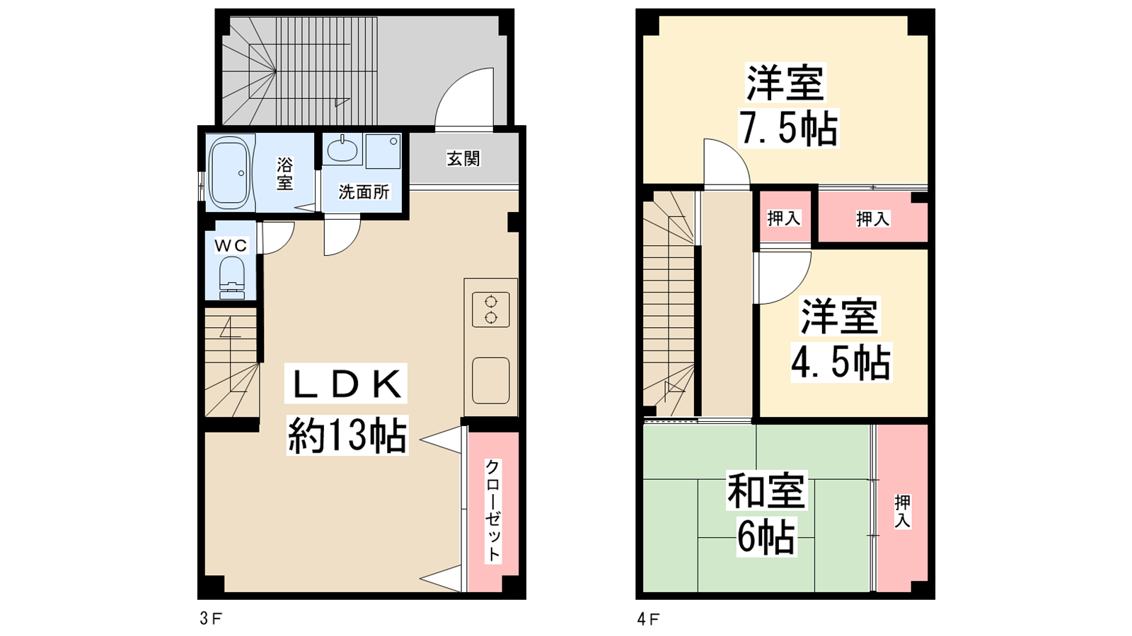 - LDK13帖、洋室7.5帖、洋室4.5帖、和室6帖