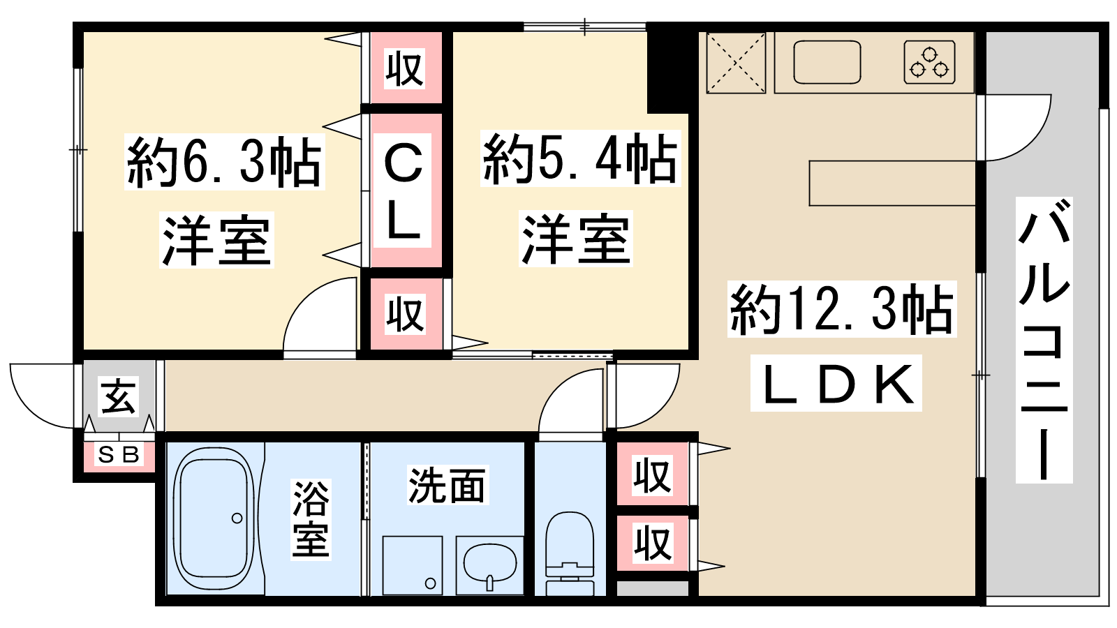 - LDK12.3帖、洋室6.3帖、洋室5.4帖