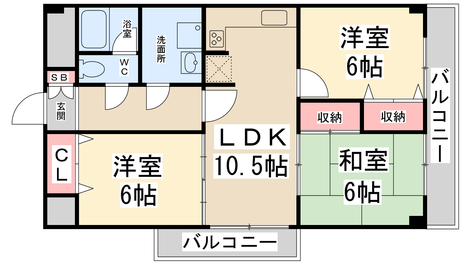 - LDK10.5帖、洋室6帖、洋室6帖、和室6帖
